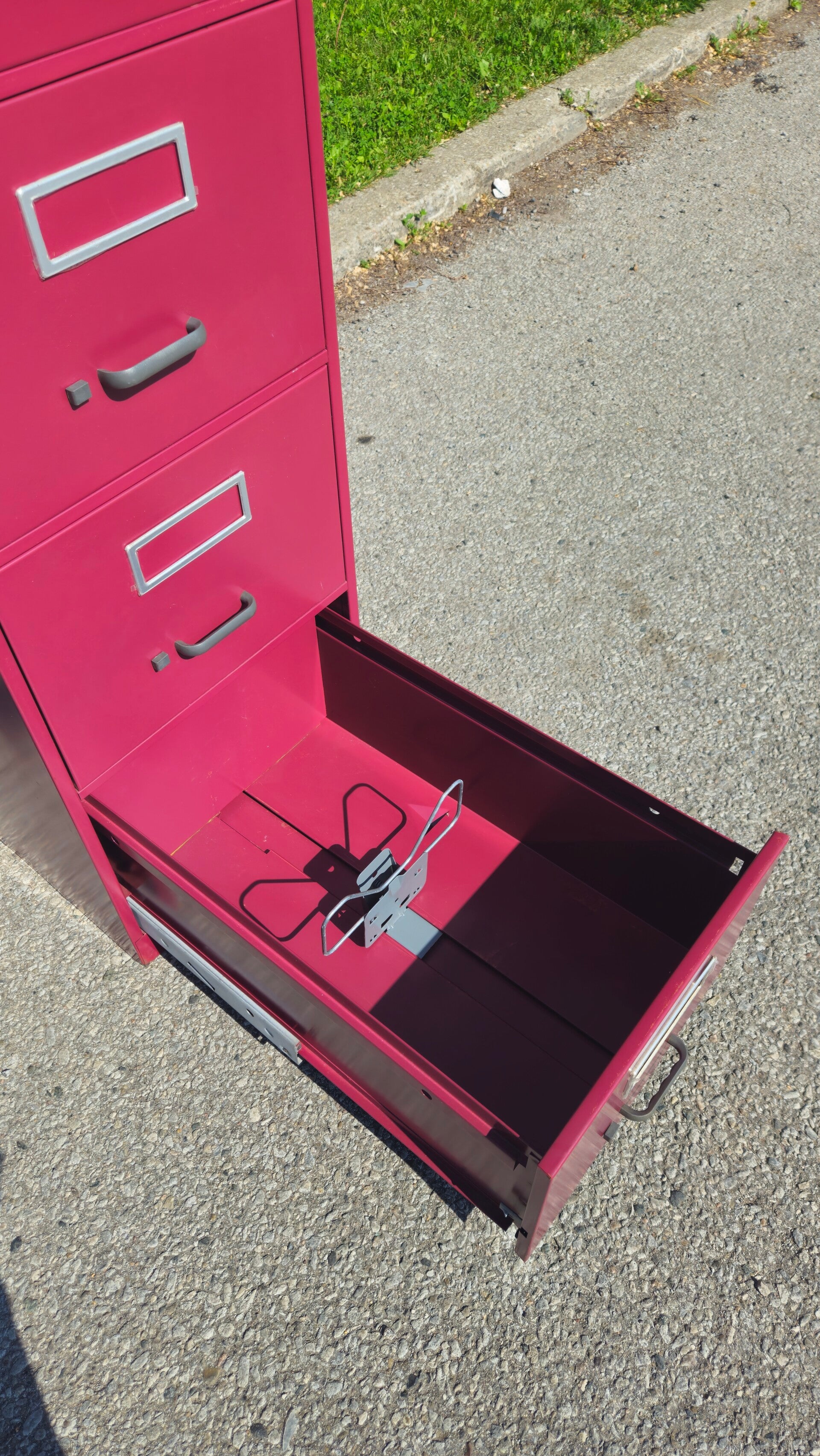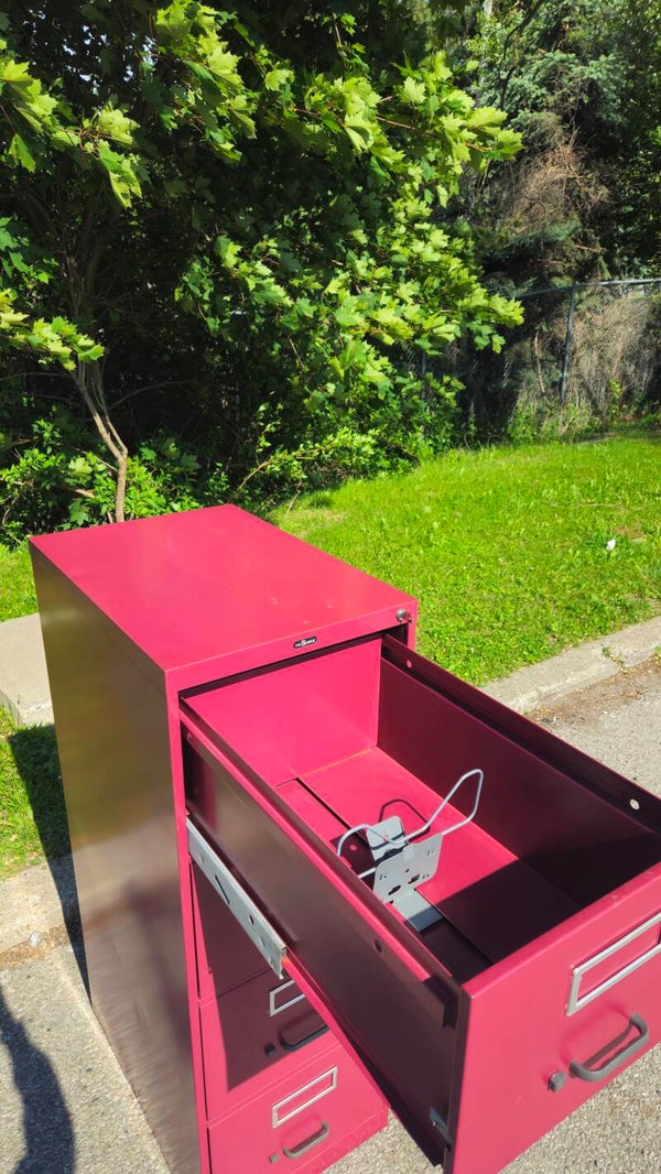 This is a pre-owned filing cabinet designed to accommodate legal-size documents, perfect for organizing your important papers. It features four drawers for ample storage and is constructed from durable metal, ensuring it can withstand regular use. The filing cabinet comes in a unique burgundy colour, adding a touch of style, to your office space.