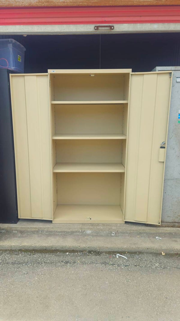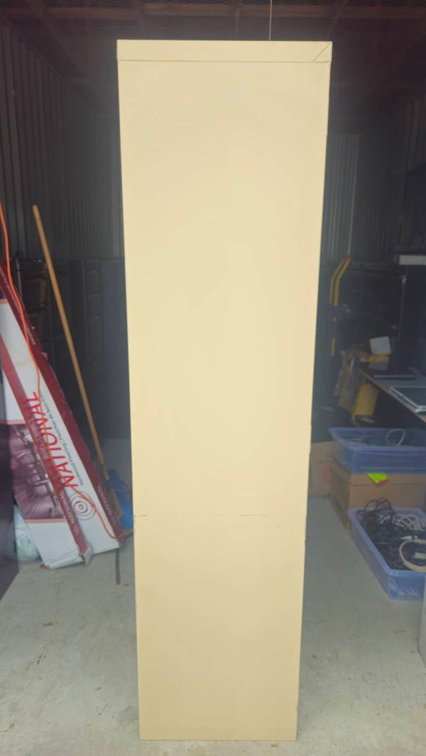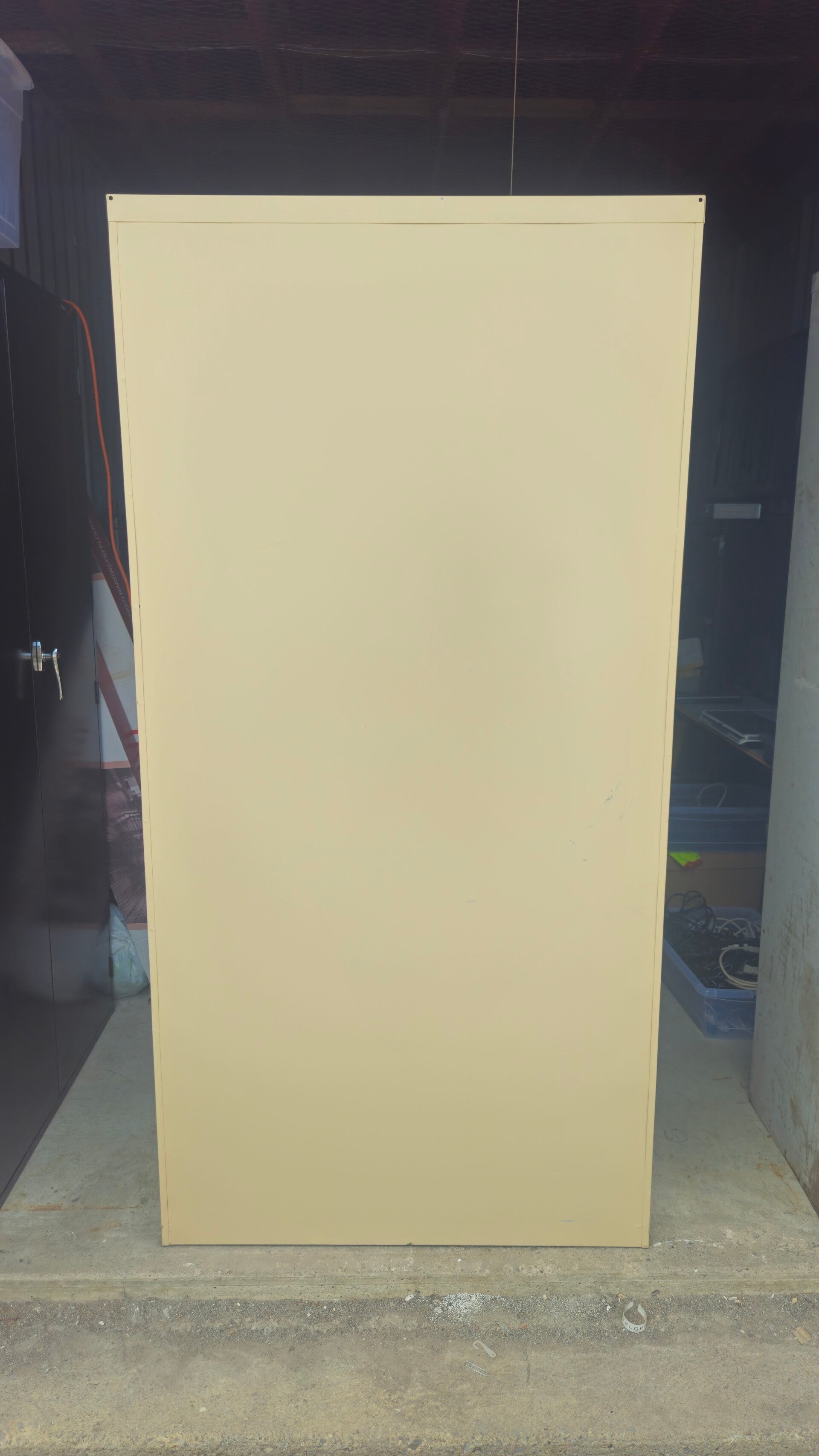 This metal cabinet, perfect for storage in a garage, workshop, or office. It features multiple shelves and a lockable door for security. The cabinet is in good condition!