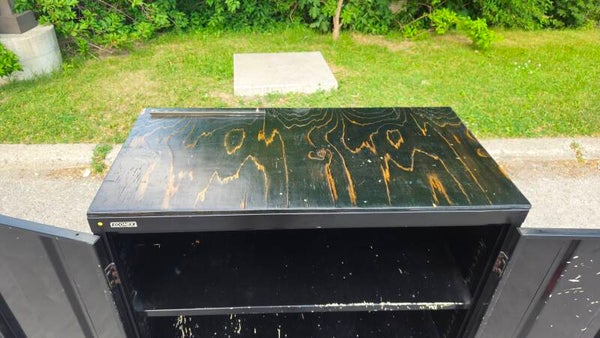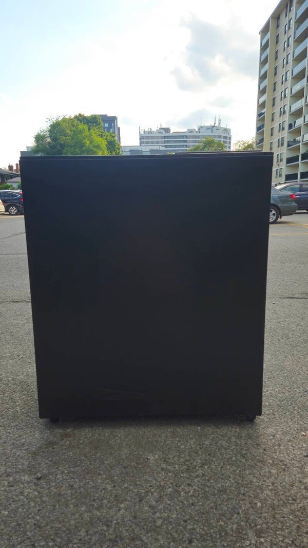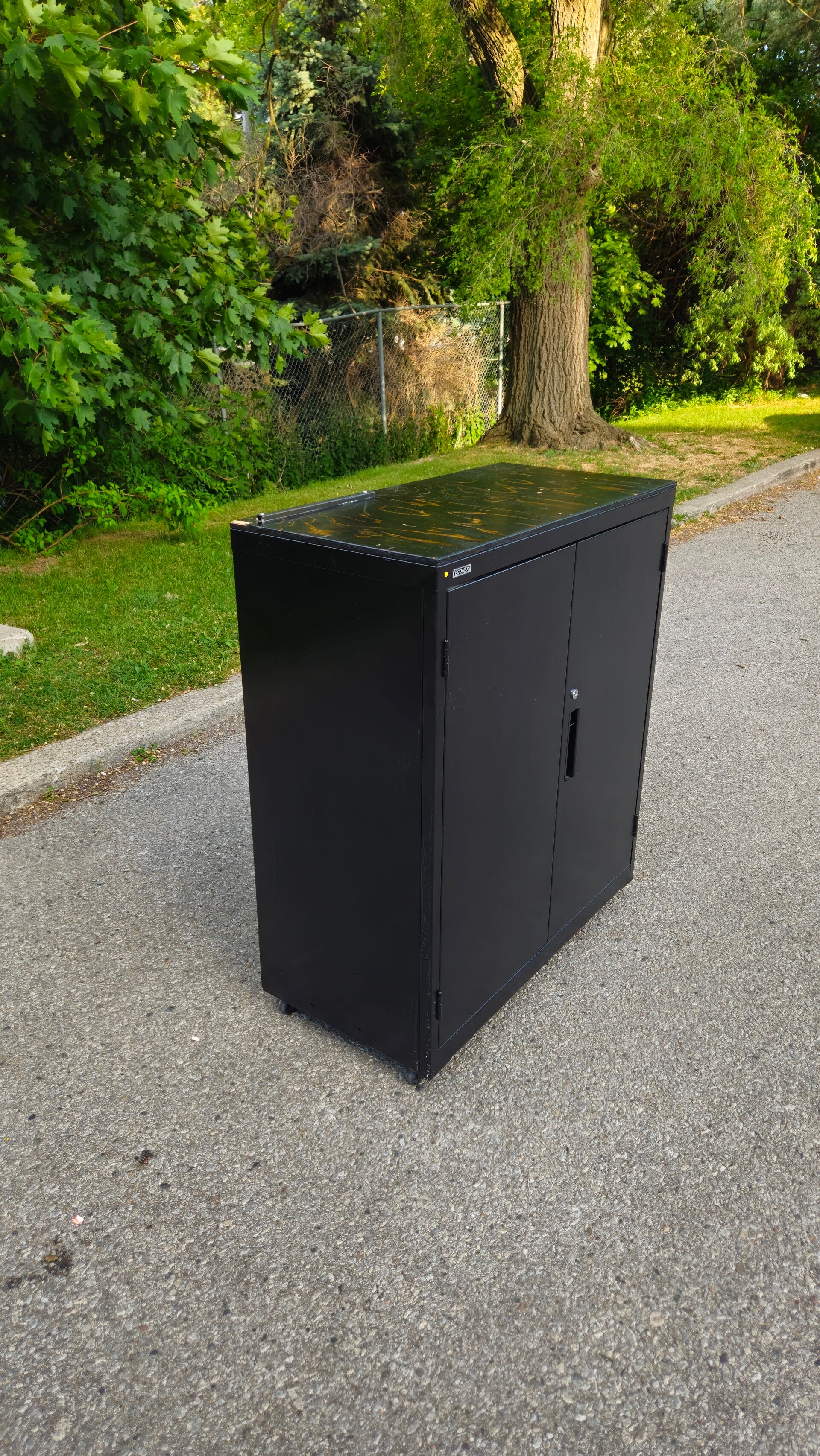 This black metal cabinet is a robust storage solution for any workspace or garage. It's fully functional and ready to organize your tools or supplies.